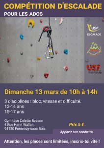 Samedi 9 avril, de 13h à 17h30, se déroulera la rencontre d’escalade enfants interclubs organisée par la section montagne escalade de l’US Ivry.
